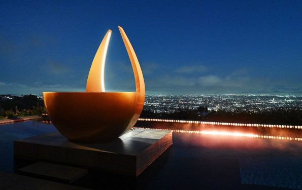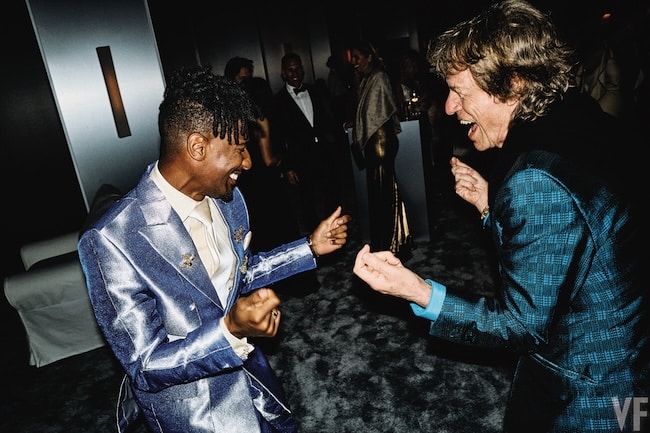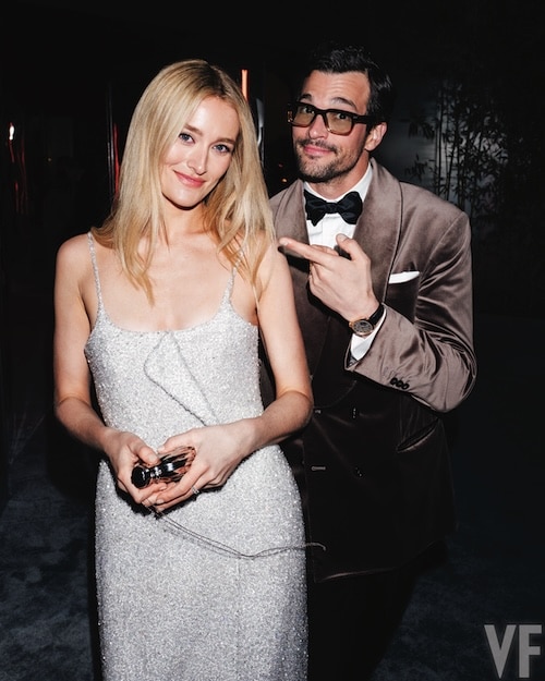 Celebrities began to arrive at LACMA for the Official Vanity Fair Oscar Party. A 100-foot-long silver wall under the building canopy was set up to screen the red carpet and press areas, framing a row of illuminated bronze figures on concrete plinths by Auguste Rodin from the museum’s permanent collection. The Vanity Fair red carpet livestream, presented by Lilly and L’Oréal Paris, kicked-off with hosts Brittany Broski, Jake Shane, and