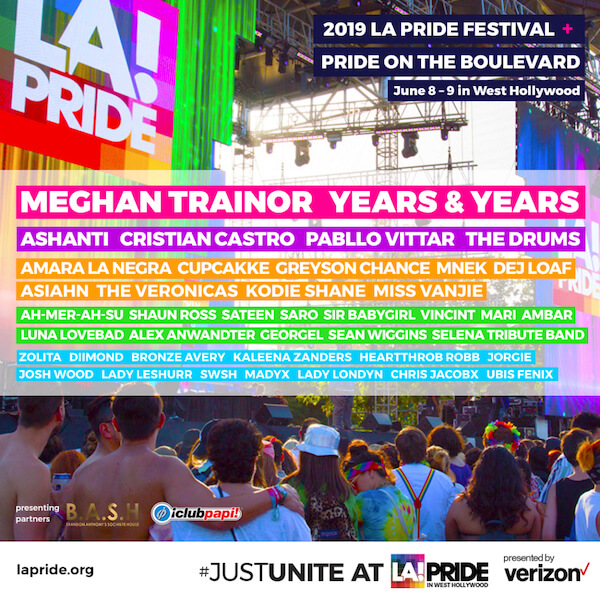 Ticketed – It’s that time of year again! Get ready for the 2019 LA Pride Festival in West Hollywood, presented by Verizon! A diverse group of LGBTQ+ and allied performers are taking the stage at the 2019 LA Pride Festival in West Hollywood, presented by Verizon. GRAMMY Award-winning global superstar Meghan Trainor and British electronic pop trio Years & Years will headline this year’s festival on Saturday, June 8 and Sunday, June 9 — joined by GRAMMY Award winner Ashanti, plus Amara La Negra, Dej Loaf, Greyson Chance, MNEK, Pabllo Vittar, Ah-Mer-Ah-Su, and more!