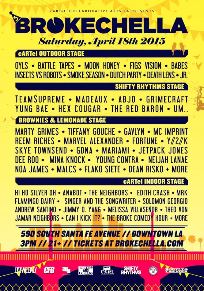 3:00 pm - 11:30 pm Brokechella 2015 April 18, 2015 @ 3:00 pm - 11:30 pm Brokechella 2015 Ticketed - This year, BROKECHELLA is back to 590 Santa Fe Ave, in the heart of Downtown. We’ve got 4 stages, a World Initiative, comedy and variety stage, a bigger than ever vendor fair, more puppychella, giant jenga puzzles, and so much more.