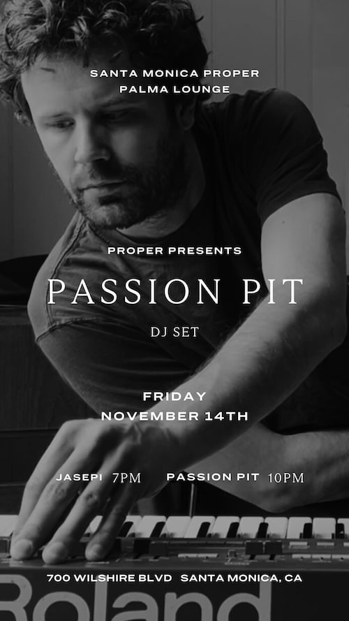 November 14, 2025 @ 7:00 pm - 11:30 pm Proper Presents: Passion Pit (DJ Set) Santa Monica Proper Hotel 700 Wilshire Blvd, Santa Monica RSVP - Gold Sky Productions, Condesa Gin and POM Wonderful have partnered with the Santa Monica Proper Hotel to bring you an unforgettable DJ set by Passion Pit and opening set by Jasepi.