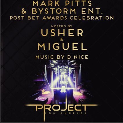 June 28, 2015 @ 10:00 pm 2015 BET Awards After Party feat Usher & Miguel Project Los Angeles 6356 Hollywood Blvd, Los Angeles, CA, United States Table Reservations - Project Club LA is proud to host the 5th Annual Mark Pitts & Bystorm entertainment Post BET Awards, featuring R&B sensations Usher & Miguel this sunday, June 28th, at 10pm.