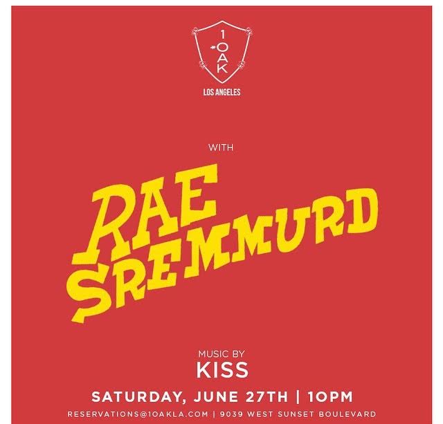 June 27, 2015 @ 10:00 pm Rae Sremmurd @ 1 OAK 1 OAK 9039 Sunset Boulevard, West Hollywood, CA, United States Table Reservations - Head over to 1 OAK during BET Award weekend, with a Rae Sremmurd takeover happening tonight.