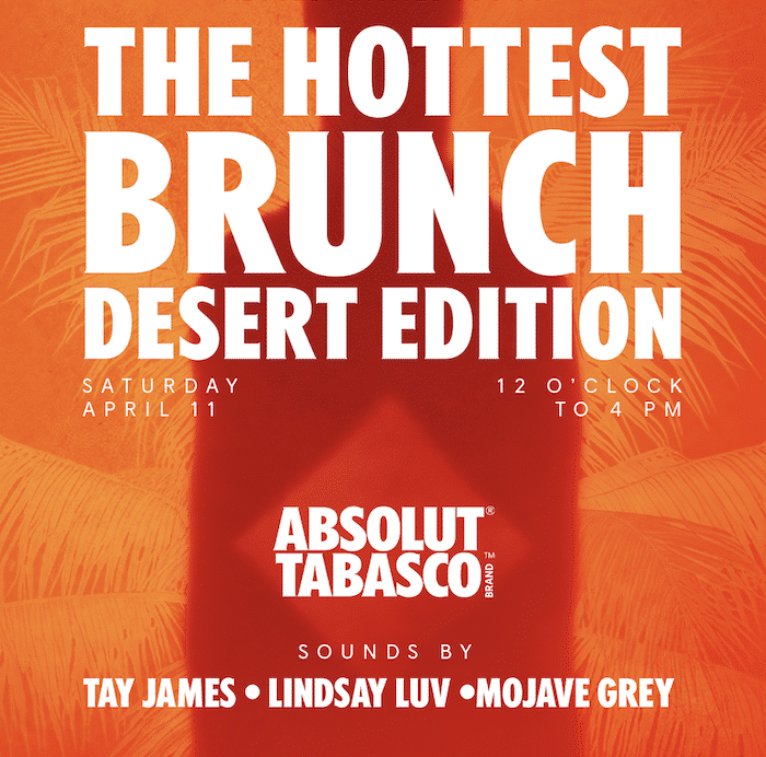 12:00 pm - 4:00 pm ABSOLUT Desert Brunch Edition April 11 @ 12:00 pm - 4:00 pm ABSOLUT Desert Brunch Edition Invite Only - ABSOLUT is hosting The Hottest Brunch Desert Edition on Saturday, April 11thin celebration of ABSOLUT Tabasco. Opening Sounds by DJ Lindsay Luv, Featured Set by DJ Tay James, Closing Set by Mojave Grey. Guests will enjoy sips and small bites before heading to the festival.