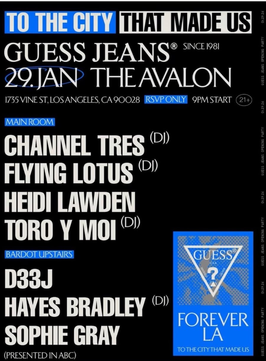 GUESS Jeans: Forever LA January 29 @ 9:00 pm - January 30 @ 1:00 am Avalon 1735 Vine St., Los Angeles, CA, United States Invite Only - GUESS Jeans is paying homage to the city that made them with an endless music lineup at Forever LA including Channel Tres, Flying Lotus and many more.