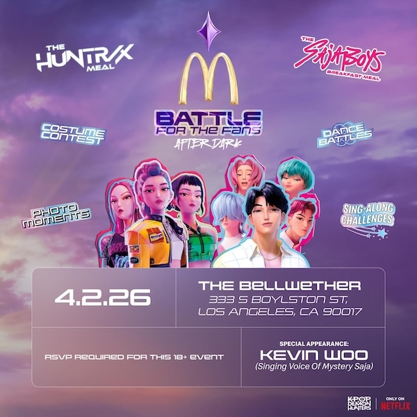 KPop Demon Hunters x McDonalds April 2 @ 7:30 pm - 11:00 pm The Bellwether 333 S. Boylston St., Los Angeles, Los Angeles, United States RSVP - McDonalds is bringing KPop Demon Hunters fans together for a one-night-only dance party "Battle for the Fans: After Dark"! Guests are invited to proudly express their fandom by dressing up as any character from the movie!